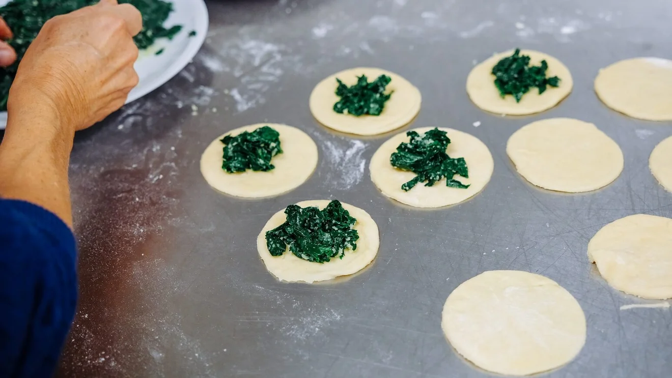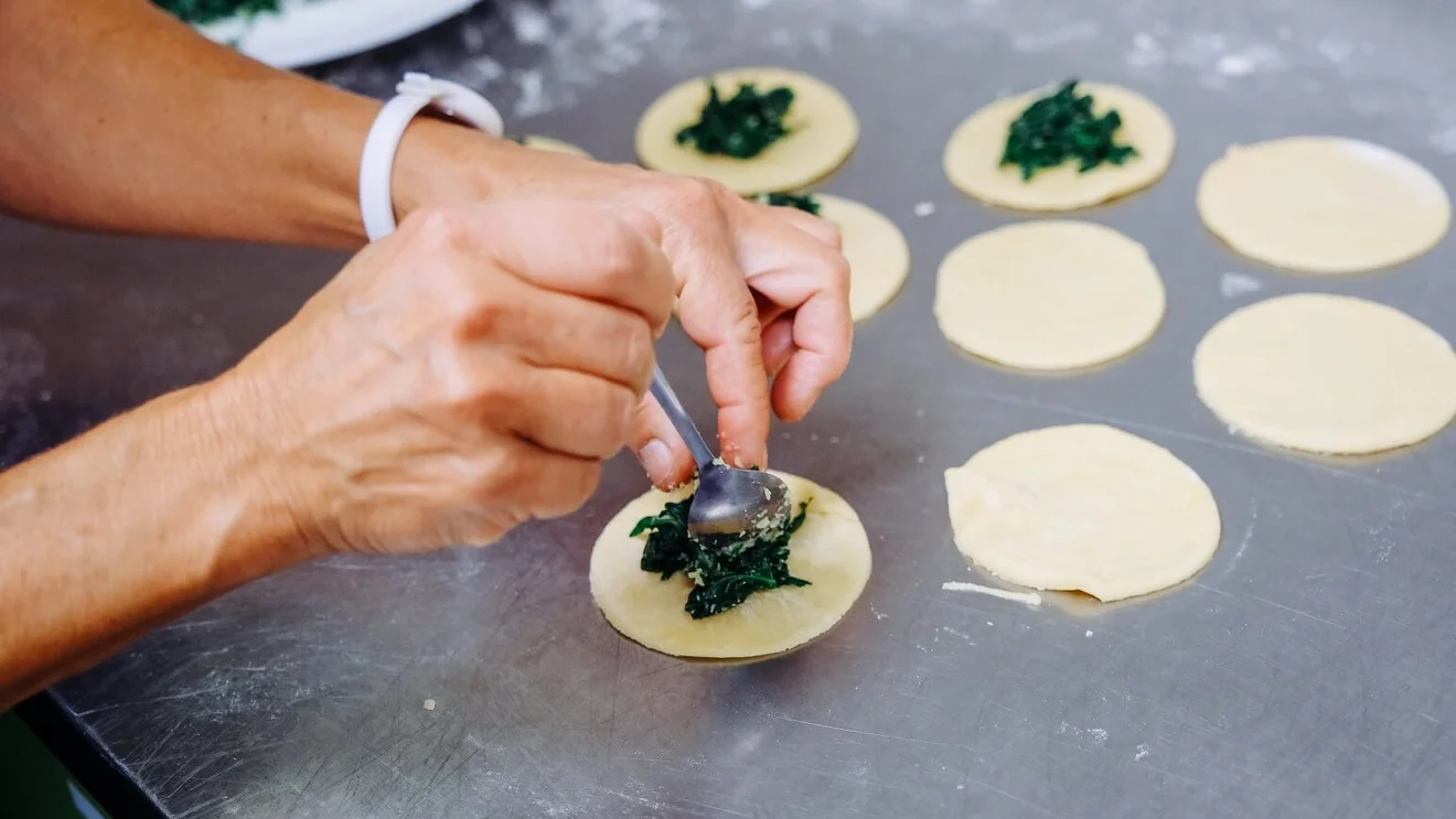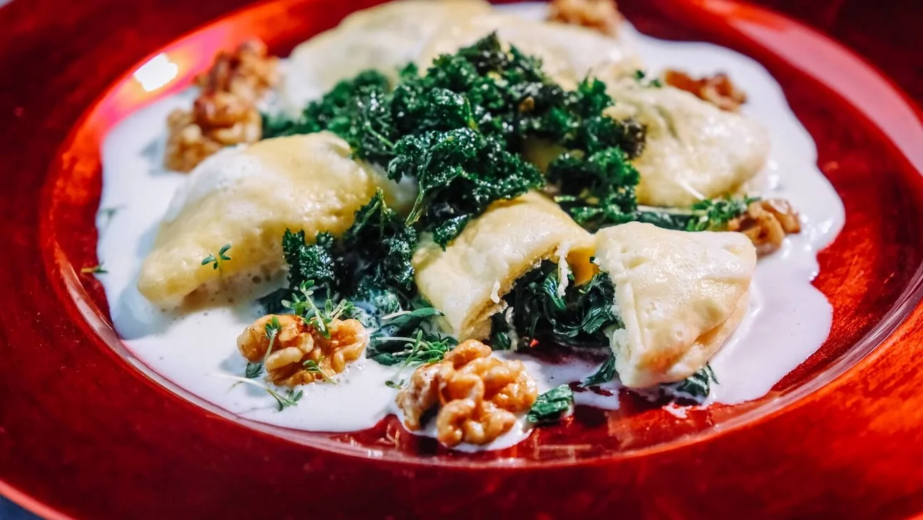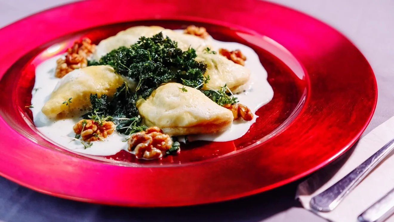 In unserer Bildergalerie zeigen wir Eindrücke von der Zubereitung der Spinat-Dampfnudeln – vom Teig über das Füllen bis zum Anrichten mit Käsesoße, Walnüssen und gebackener Petersilie.
