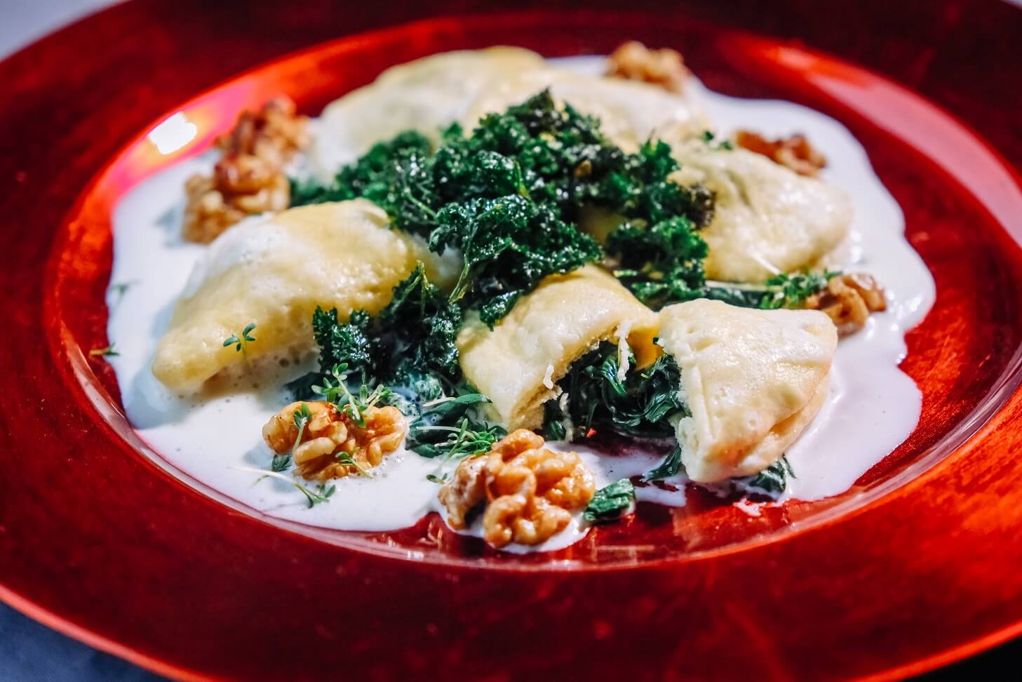 Spinat-Dampfnudeln in Käsesoße mit gerösteten Walnüssen und gebackener Petersilie