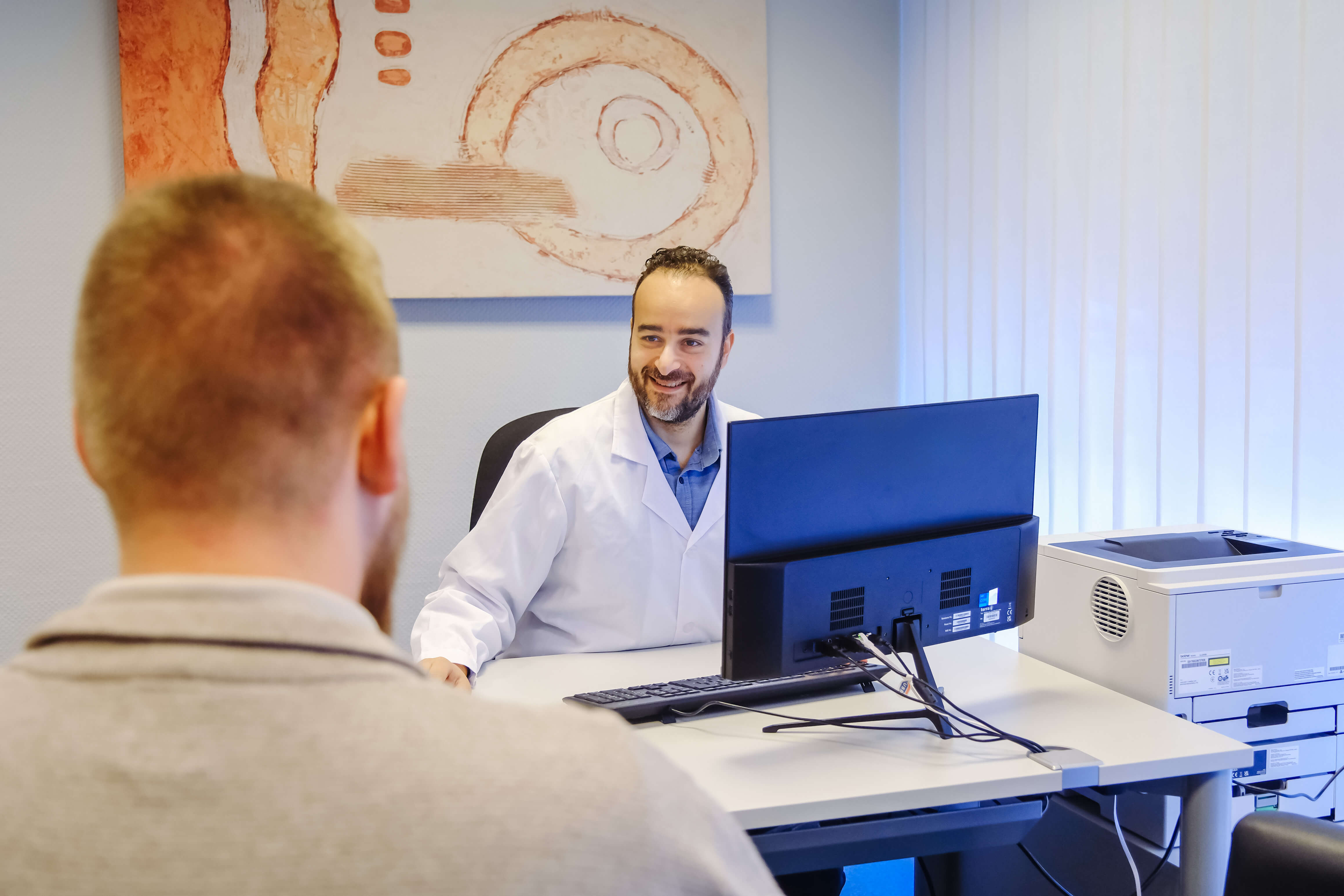 Ein weiterer Vorteil des Umzugs: Das MVZ ist jetzt barrierefrei. Zweiter Stock ohne Fahrstuhl: Das gibt es nicht mehr. Insgesamt elf Behandlungs- und Sprechzimmer wurden eingerichtet, inklusive interessanter Kunstwerke. Im Entree geht es gleich farbenfroh los mit einem gemalten Fahrrad auf einer Blumenwiese. „Die komplette Einrichtung ist neu. Als Dank für die Geduld unserer Patienten und Mitarbeiter mit den bisher eher kleinen Räumen haben wir gesagt: Jetzt ist die Chance für ein neues Level“, so Dr. med. Adel Mahdy.