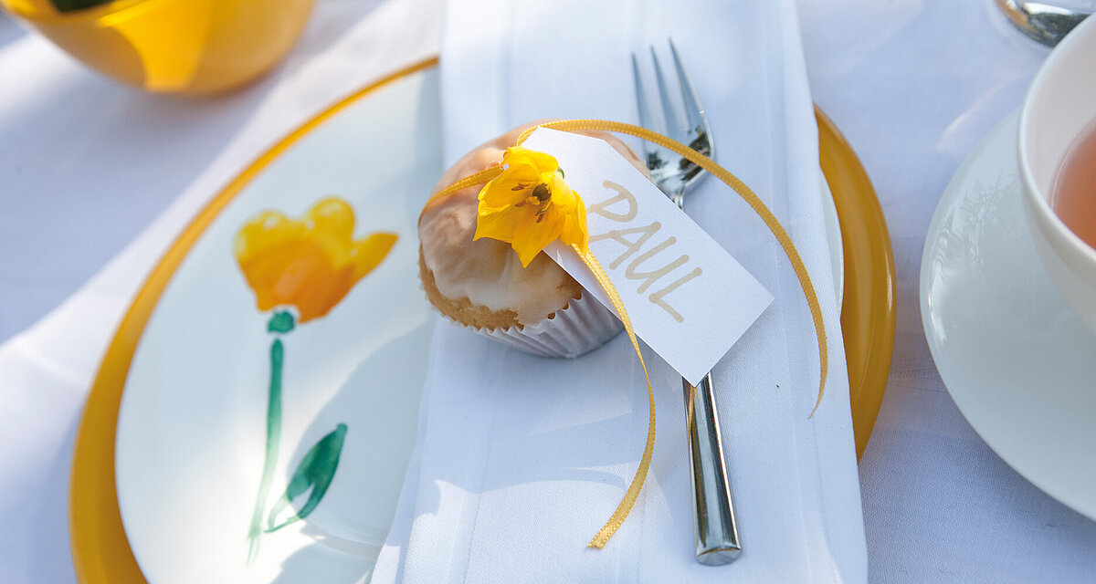 Wer auch beim Essen nicht auf Blumendekor verzichten will, sollte sich das Geschirr Impressionen der Porzellan-Marke Dibbern bei Hohls besorgen. Dort sind einzelne Blüten wie mit Aquarellfarbe aufgemalt. Dazu passt hervorragend buntes Glasgeschirr. Dabei kommt dann noch mehr Farbe auf den Tisch, empfiehlt die weltraum-Dekoexpertin. Wer dann noch zur Kaffeetafel bittet, Platzkärtchen etwa mit gebackenen Muffins und einem bunten Schleifchen platziert, erntet garantiert ein Lob der Gäste für die tolle Deko - nicht nur beim Perfekten Dinner.
