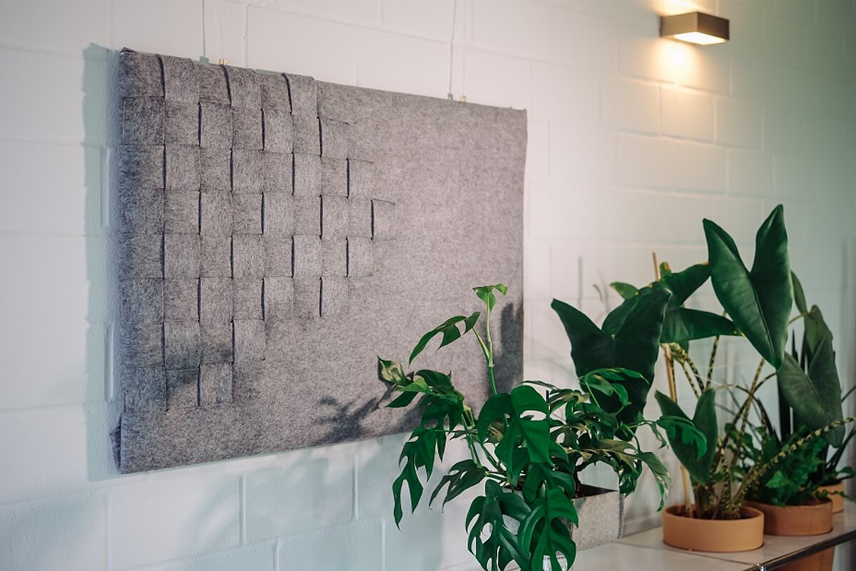 Wie wäre es mit einem gepolsterten Bild aus Filz? Einfach selbst machen. Belegen Sie eine Trägerplatte mit Volumenflies und bespannen Sie sie mit Filz. Dann alles von hinten festtackern und dabei ein Muster aus verschiedenen Farben oder ein Webmuster gestalten. Fertig ist das Unikat. Die weiche Oberfläche absorbiert Schall und trägt dazu bei, die Luftfeuchtigkeit zu regulieren.