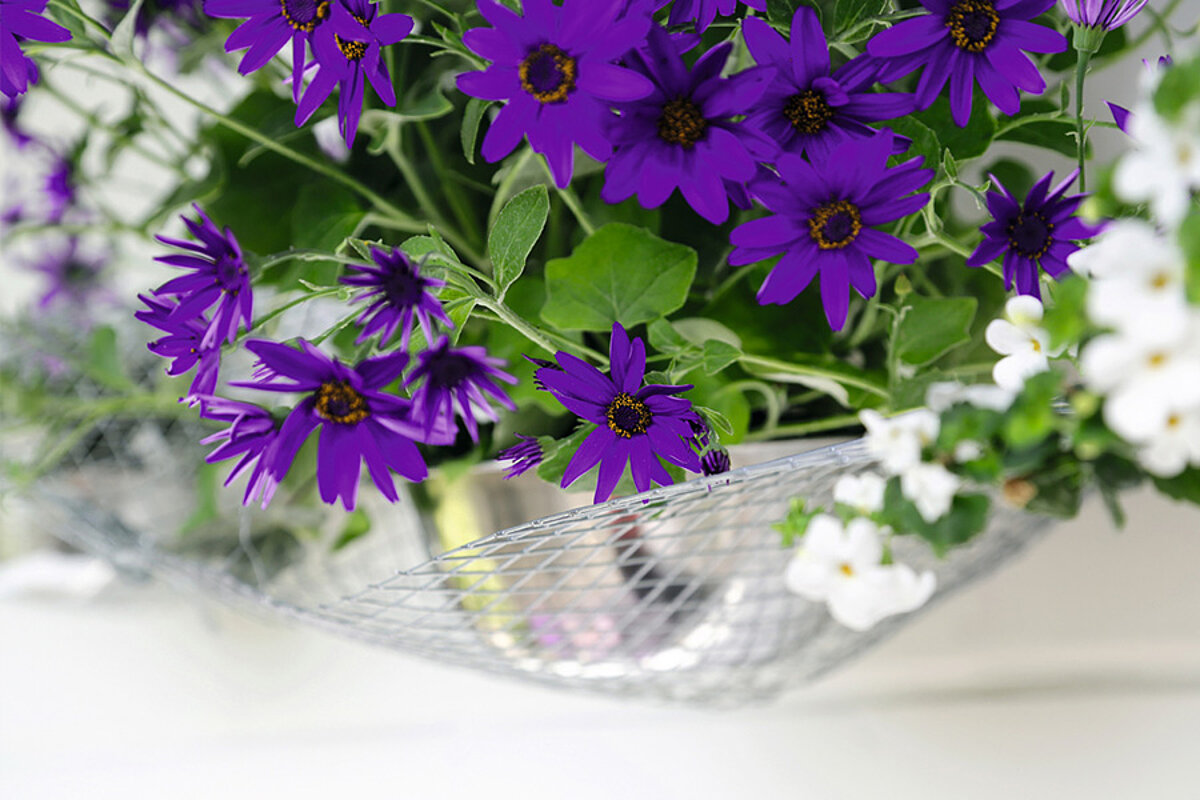 Beim ersten Dekotipp wollen wir ausprobieren, wie sich Pflanzen an der Wand machen, etwa als Ersatz für ein Bild. Das Ganze hat dann auch nicht viel mit einer herkömmlichen Blumenampel zu tun, sondern sieht schicker und moderner aus. weltraum-Dekoexpertin Andrea Müller setzt dafür in eine Welle aus Drahtgeflecht drei Pflanzschalen aus Cromargan ein. Die werden mit blühenden Pflanzen ausgestattet. Die Welle wird dabei um die Schalen herumgeformt, indem der Draht an den entsprechenden Stellen eingeschnitten und zusammengedrückt wird. Dadurch entstehen Mulden für die Schalen. Für eine dekorative Untersicht befestigt Andrea Müller am Draht silbern glänzende Schmetterlinge. Aufgehängt werden sollte das Drahtgeflecht mit ebenfalls silbernen Drähten, die dann an mehreren Punkten befestigt und oben zusammengefasst werden. Die moderne Blumenampel kann dann im Zimmer oder auf dem Balkon angebracht werden.