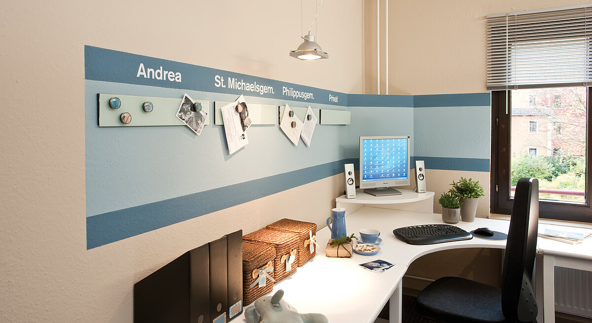 Auch über den beiden antiken, weiß gestrichenen Schreibtischen aus Familienbesitz wurde mit Pendelleuchten ein neues Beleuchtungssystem geschaffen. Die schon für das Pult verwendete Farbe Blau wird auch über den Schreibtischen wieder aufgegriffen, in Form eines blauen Farbstreifens. Um die störenden Heizungsrohre zu verdecken, wurde darüber noch eine tapezierte Platte über Eck angebracht. Zusätzlich installierte unser Dekoteam noch vier Magnettafeln, nutzbar für verschiedene Themen. Die einzelnen Pinnwände wurden mit Wandtattoo-Buchstaben aus dem Internet verschönert. Und wie kam die Überraschung an? Meinem Mann blieb der Mund offen stehen. Er hat erstmal ungläubig reagiert. Jetzt sitzt er in seinem neuen Zimmer und genießt nur noch, erzählt Andrea Otto. Die Familie mit den drei kleinen Kindern Sophie, Hannah und Lara war erst vor Kurzem nach Wolfsburg gezogen. Jetzt sind wir endgültig angekommen. Mit der Umgestaltung des Arbeitszimmers sieht es jetzt in allen Räumen so aus, wie ich mir das vorstelle. Großes Kompliment an Andrea Müller und das tolle Handwerker-Team der NEULAND, strahlt die Dreifach-Mami. Einen Nachteil hat die Umgestaltung allerdings gehabt: Papa Andreas will den neuen Raum jetzt nicht mehr teilen. Er verteidigt sein Reich, weil es ihm besser gefällt als vorher, lacht Andrea Otto. Naja, vielleicht kann man ja Besuchszeiten im neuen Arbeitszimmer einführen. Ansonsten hat sich mal wieder gezeigt: Das weltraum-Gewinnspiel lohnt sich nicht nur, weil man tolle Preise gewinnen kann sondern auch, weil man einem lieben Menschen damit eine schöne Freude macht.