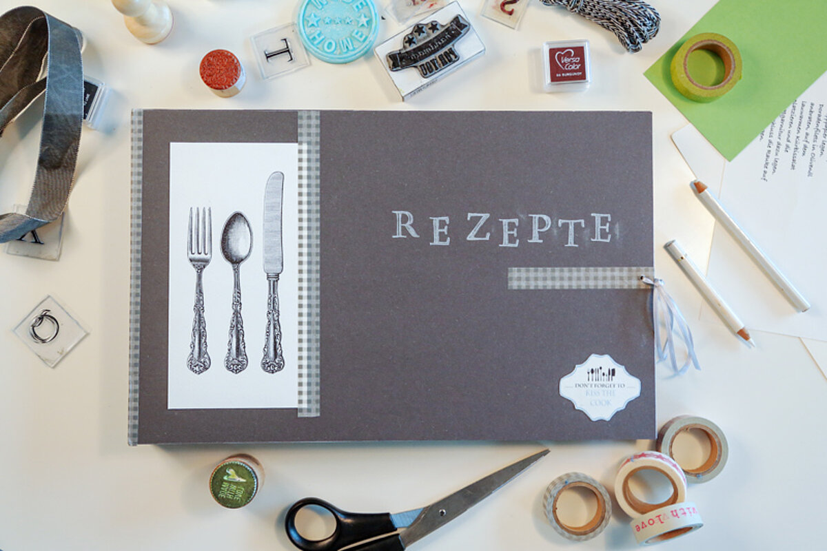 Bevor Sie loslegen, sollten Sie sich zuerst überlegen, wo Sie Ihre Rezepte einordnen möchten. Verwenden Sie (wie in unserem Beispiel) einen Ringordner, so können Sie diesen wie dargestellt bekleben und die separat gestalteten Rezeptseiten einheften. Alternativ wählen Sie ein leeres Notizbuch, in das Sie die Inhalte einkleben. Dazu empfiehlt sich Masking Tape, also bedrucktes Klebeband. Damit verziehren Sie die Seiten und verwenden es, um Rezepte, Bilder und mehr in das Buch zu kleben. Tipp: Benutzen Sie auch Stempel!Sowohl Buchstaben als auch Motivstempel erzeugen schöne Effekte. Und mit gut abgestimmten Papiersorten und Farben wird das Buch bunter. In unserem Beispiel hat Expertin Andrea Müller die Anleitung der einzelnen Rezepte per Computer auf verschiedenfarbige Seiten gedruckt, einzelne Buchstaben gestempelt, Bilder eingeklebt, die Zutaten aber selbst geschrieben und sie dann mit Klettband auf den Seiten fixiert. Praktisch: So lässt sich die Liste immer wieder aus dem Buch entfernen und zum Einkaufen mitnehmen.