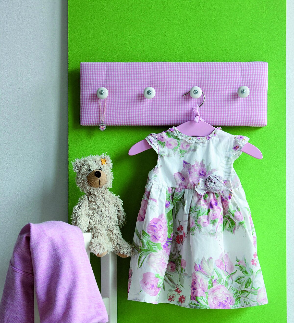 Vor allem Eltern mit Kindern freuen sich, wenn die Jacke nicht immer nur auf dem Boden in der Ecke landet. Deshalb beschäftigen wir uns zuerst mit der schnellen und einfachen Gestaltung einer Kindergarderobe. Dafür besorgen wir uns im Baumarkt eine Spanplatte und Möbelknöpfe. Dazu wird Stoff in entsprechender Größe gekauft mit einem Fleece zum Drunterlegen. Der Stoff muss auf der Rückseite der Platte festgetackert werden. Zum Schluss die Möbelknöpfe anschrauben und das Ganze mit Haken oder Laschen an der Wand befestigen. Fertig. Kostenpunkt je nach Stoff und Knöpfen: 15 bis 20 Euro.