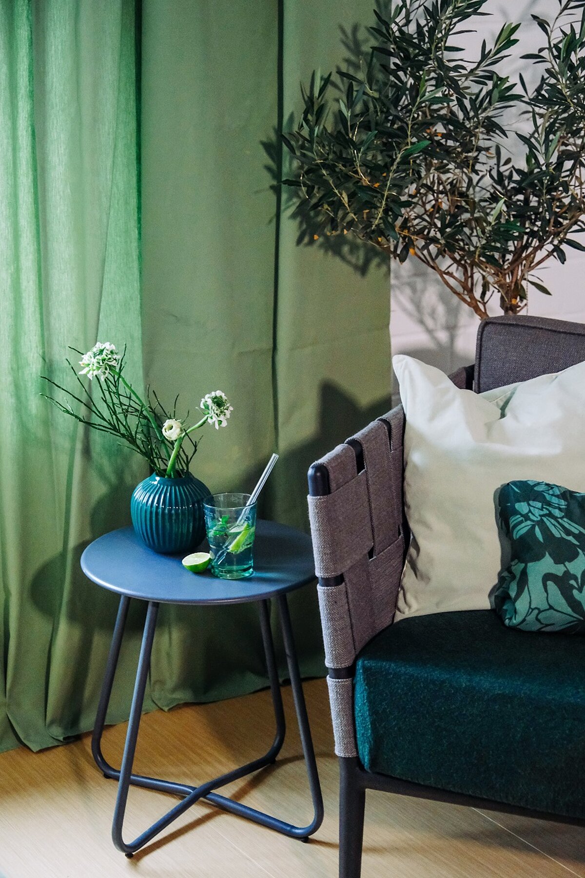 Farben sorgen für Atmosphäre. Unsere Deko-Expertin Andrea Müller bevorzugt das wohltuende und entspannende Grün. Da die Sekundärfarbe aus Gelb und Blau besteht, besitzt sie ein sehr umfangreiches Farbspektrum: von Limonen- über Apfel- bis Tannengrün. Am besten kombiniert man eine Wandfarbe mit Bezugs- oder Vorhangstoffen aus der gleichen Farbfamilie. Eine waldgrüne Wandfarbe braucht allerdings hellere Partner, damit das Ganze nicht zu düster wirkt. Grünpflanzen bringen Lebendigkeit in die Räume. Und Textilien aus Naturmaterialien wie Samt oder Seide in Grün unterstreichen die Farbe auf natürliche Weise. Wer mutig ein paar zusätzliche Farbtupfer in den Raum bringen möchte, nimmt die Komplementärfarbe Rot, Orange oder Aubergine.