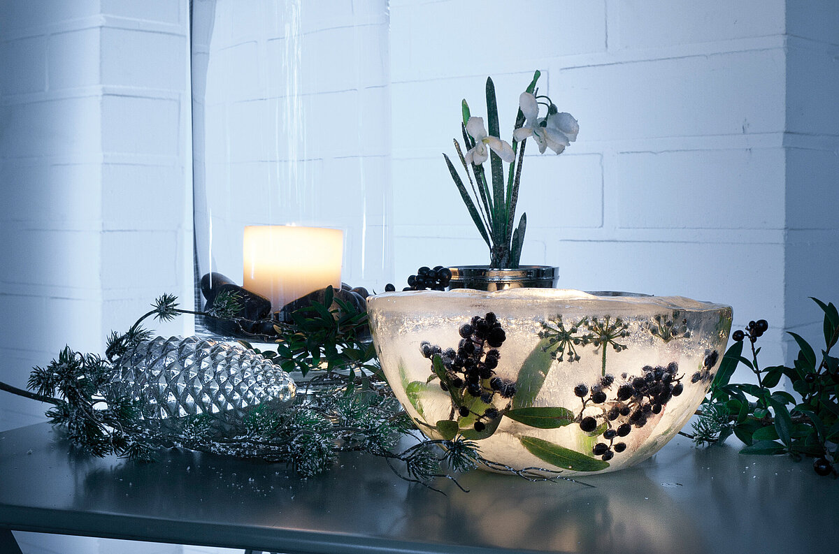Den Tisch etwa vor dem Fenster oder der Balkontür platzieren und mit Windlichtern oder Ähnlichem dekorieren. Hier noch ein besonderer Tipp für das Selbermachen von Windlichtern zum Nulltarif: Windlichter aus Eis sind dabei ein echter Hingucker. Hierfür nehmen wir uns zwei verschieden große Schalen und stellen sie ineinander. Danach wird der Raum zwischen den Schalen mit Wasser gefüllt. Das Ganze kommt dann in den Gefrierschrank oder, wenn es kalt genug ist, nach draußen, bis aus dem Wasser eine Eisschale geworden ist. Dazu noch ein Tipp: einen hübschen Akzent bekommt das Ganze, wenn man etwa Beeren, Efeublüten oder Hagebuttenzweige mit einfriert und so die Eisschale entsprechend gestaltet. In die kommt dann noch logischerweise eine Kerze und fertig ist das Windlicht. Zubehör für die praktischen Winterideen gibt es unter anderem auch bei der Firma Hohls.