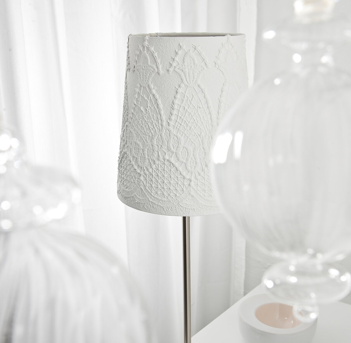 weltraum-Dekoexpertin, Andrea Müller, gestaltet gleich vier Lampenschirme für eine Tischlampe in verschiedenen Stilarten. So ist für jeden Geschmack etwas dabei. Der erste Lampenschirm bekommt das Prädikat klassisch mit Spitze. Dafür nimmt Andrea Müller einen weißen Schirm, dazu Spitzenstoff aus der Gardinenabteilung. Wichtig ist, dass die Spitze etwas dicker ausfällt. Es gilt, je altmodischer, desto besser, weiß die weltraum-Dekoexpertin. Dazu brauchen wir noch weiße Wandfarbe und einen dicken Pinsel aus dem Baumarkt. Der Lampenschirm wird mit der Spitze beklebt, die anschließend mit Farbe und Pinsel gleichmäßig betupft wird. Dadurch entsteht eine stuckähnliche Struktur. Einen Barockeffekt erzielt man zusätzlich mit goldener Sprühfarbe, die von innen aufgetragen wird.