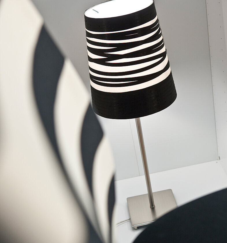 Der zweite Lampenschirm entsteht in kontrastreichem Schwarz und Weiß. Dazu braucht man schmales, schwarzes Schleifenband und doppelseitiges Klebeband. Oben und unten wird das Klebeband dann am Lampenschirm angebracht. Anschließend muss das Schleifenband sorgfältig unten um den Schirm gewickelt werden, in der Mitte kreuz und quer und oben wieder sorgfältig. Wichtig: in der Mitte das Schleifenband unsichtbar festkleben. Wer's gern bunter mag, nimmt verschiedene Schleifenbänder.