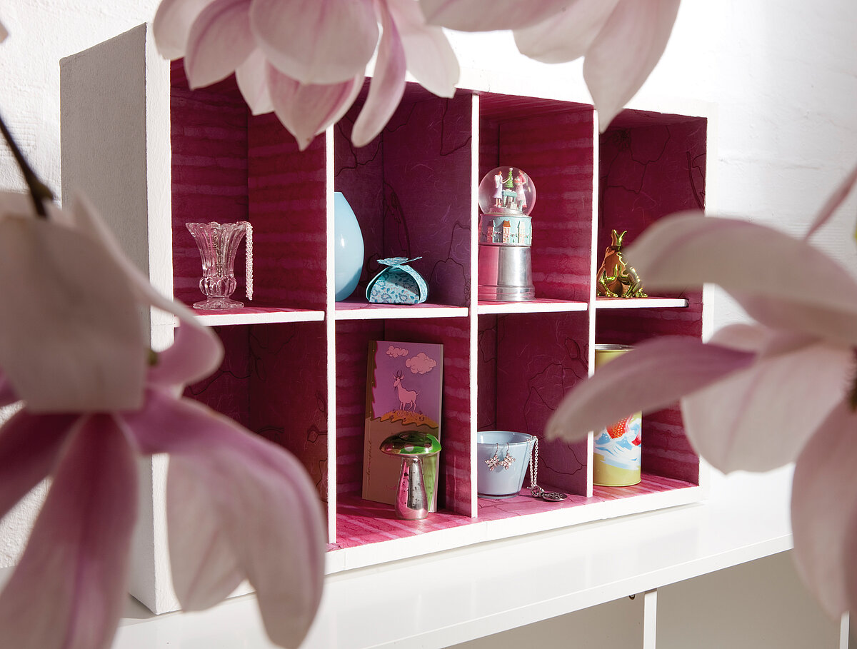 Um den Kontrast entsprechend zu verstärken und das Regal nicht zu unruhig wirken zu lassen, werden die Außenseiten weiß gestrichen. Je nach Muster und Geschmack kann man aber auch das ganze Regal mit Papier überziehen. Für die Serviettentechnik bei der Strohseide wird das Papier passgenau zugeschnitten, die einzelnen Flächen anschließend eingestrichen und das Papier darauf geklebt. Obendrauf kommt dann der Lack. Nicht davon täuschen lassen: der milchige Lack trocknet und sieht anschließend transparent aus. Kleiner Tipp: beim ersten Anstrich etwas mehr Lack nehmen. Dann bekommen die kleinen, über Jahre gesammelten Schätze den schönen neuen Platz, den sie auch verdienen.