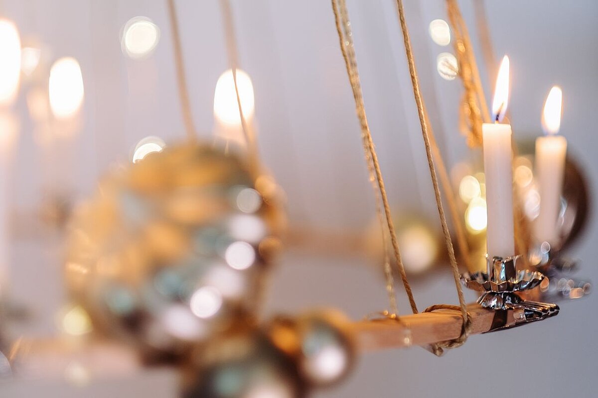 Knoten Sie zuerst vier gleichlange Schnüre in gleichmäßigen Abständen um den Reifen und fassen diese oben zu einer Schlaufe zusammen. Anschließend können Sie die Konstruktion schon einmal hinhängen, bevor Sie Bänder und Lichterketten anbringen. Die Anzahl richtet sich nach Ihrer Vorstellung. Ziehen Sie jetzt ein paar Schnüre durch die Schlaufe nach innen, um daran die Kugeln zu befestigen. Damit sich alles gleichmäßig aushängt, hat Dekoexpertin Andrea Müller über den Reifen eine Wasserwaage zum Beschweren und Ausrichten gelegt. Zum Schluss einige Christbaumkerzen in sicherem Abstand zu den Bändern