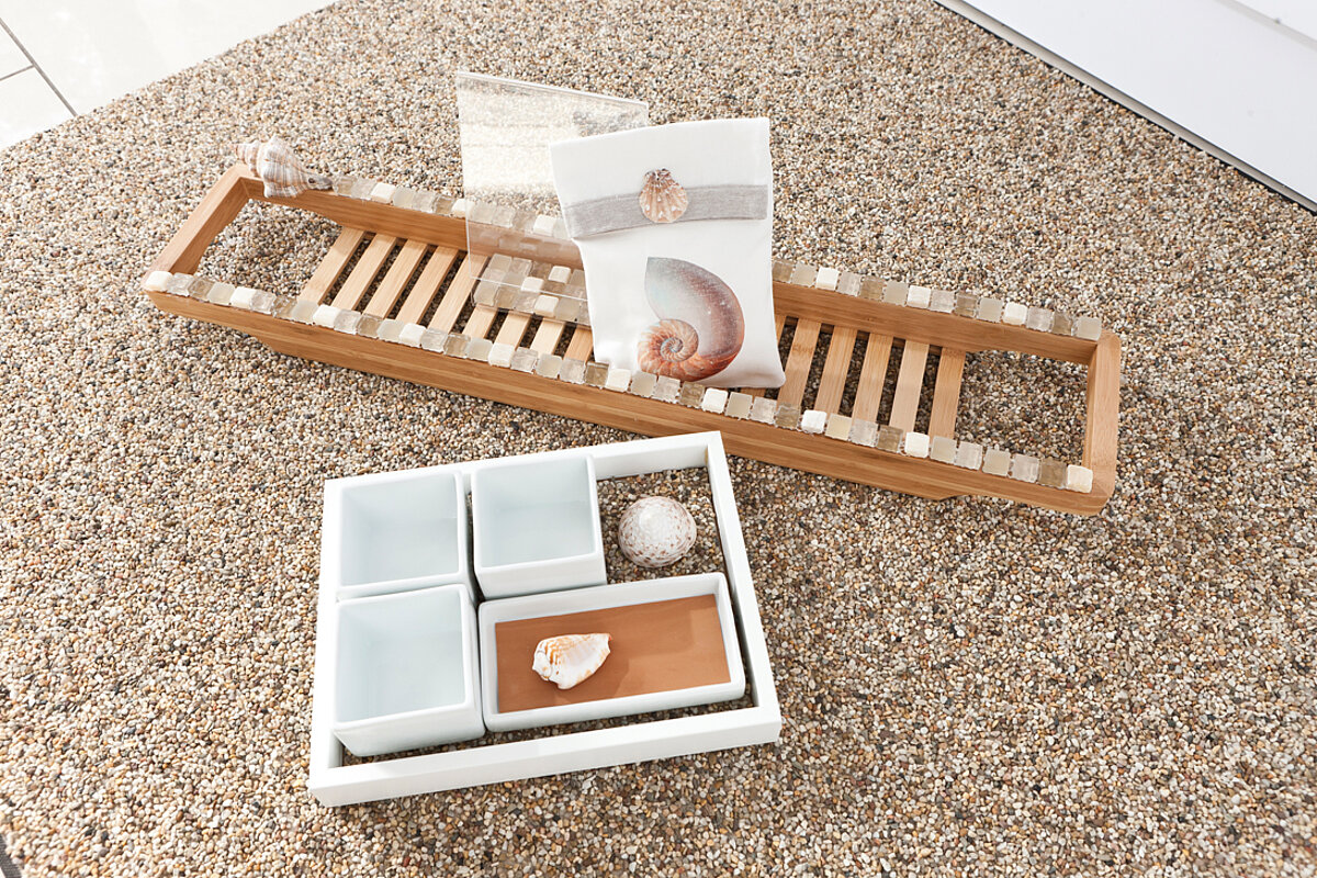 Schnell und einfach ist auch ein Badzimmer-utensilio hergestellt. Dazu besorgen wir uns einen Bilderrahmen aus einem Möbelhaus, dazu Teichfolie und Steine aus dem Baumarkt. Außerdem noch ein Holzfurnier, kleine Porzellangefäße und ein paar Muscheln zum Verzieren. Zuerst wird der Bilderrahmen als Tablett umfunktioniert. Dann wird die Teichfolie zugeschnitten und verklebt. Die Porzellangefäße werden auf dem Tablett ebenfalls verklebt. Das Furnierholz wird in einer der Schalen ausgelegt, damit der Schmuck nicht verrutscht.