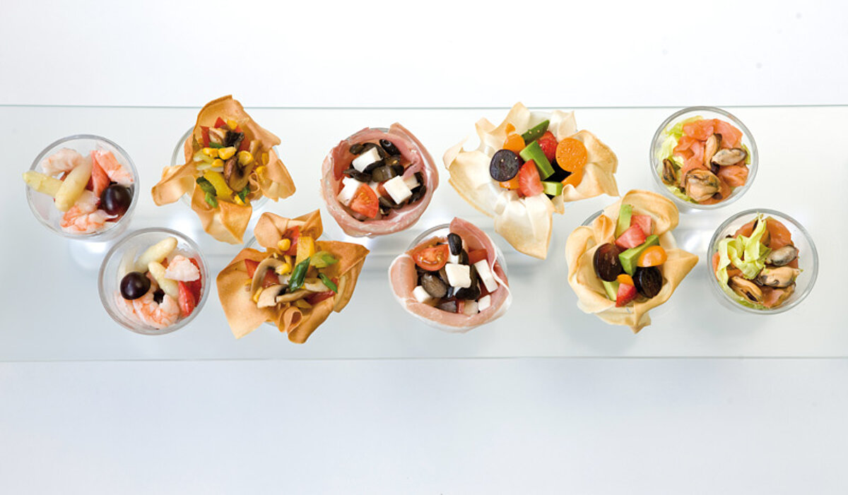 Gläser mit Frühlingsrollenteig (Asiashop) auslegen und bei 100 Grad backen. Für den Gemüsesalat gelbe und rote Paprika, Frühlingslauch, Mais und Champignons verwenden. Das Gemüse putzen, waschen und klein schneiden. In Olivenöl anschwenken, sodass es noch Biss hat. Abschließend würzen und mit etwas Balsamico abschmecken.