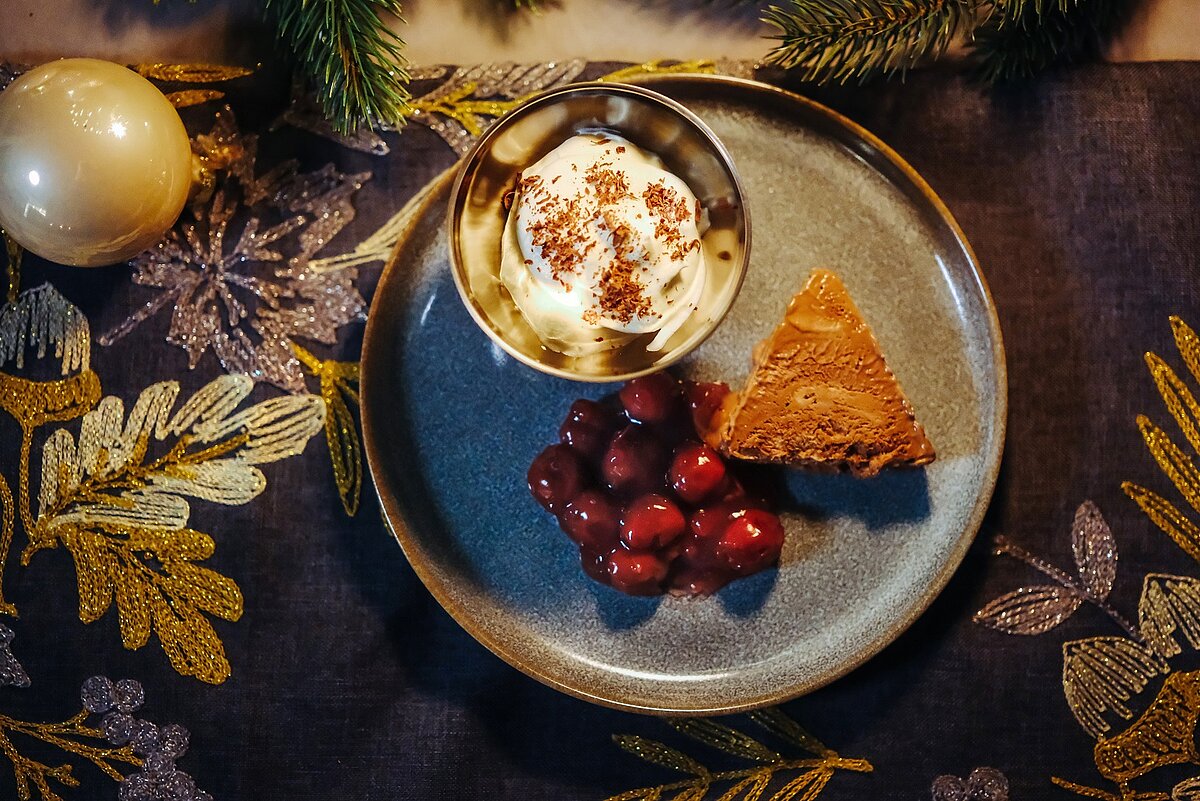 Die Masse in Formen füllen und für 6 Stunden einfrieren. Kirschen mit Zucker aufkochen und mit etwas Stärke binden. Zum Schluss das Parfait aus den Formen lösen, mit geraspelter Schokolade bestreuen und mit den Kirschen anrichten.