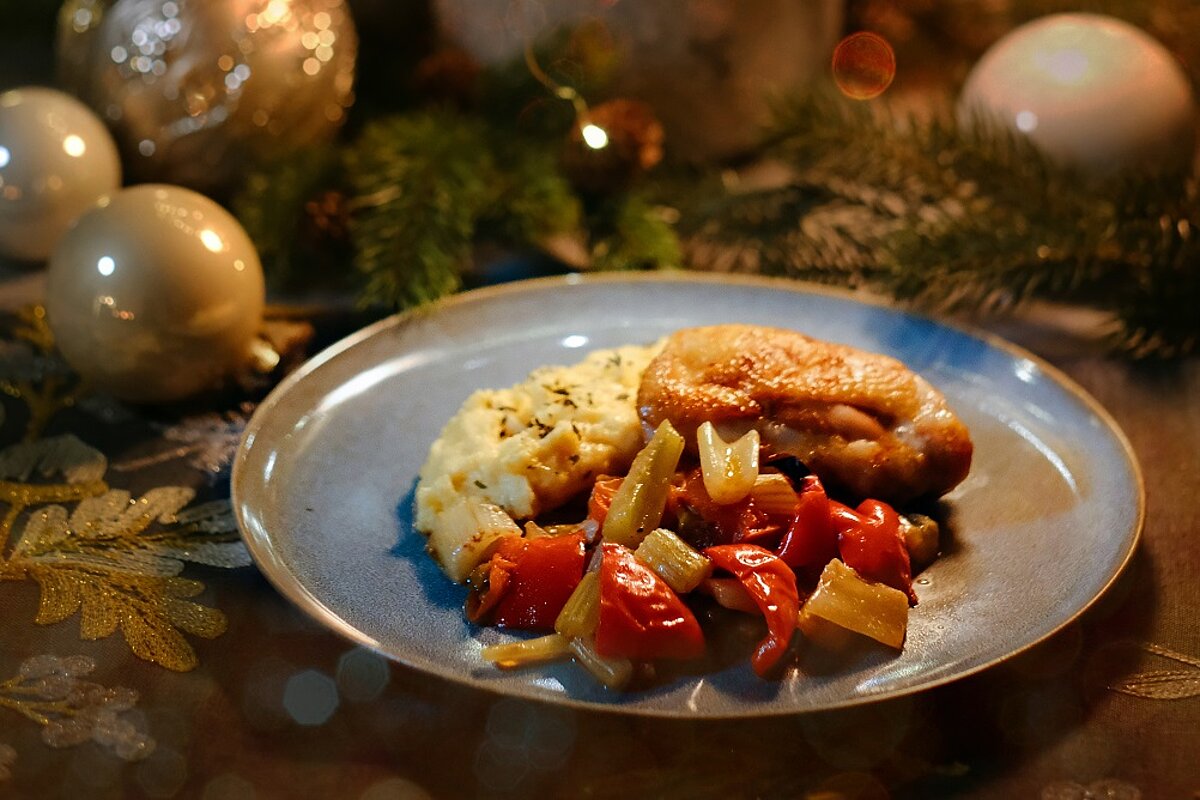 in eine Backform geben. Hähnchenkeulen mit Salz, Pfeffer und Paprikapulver würzen und auf das Gemüse legen. Bei 180 °C (wenn möglich mit Grillfunktion) etwa 40 Minuten im Ofen backen.