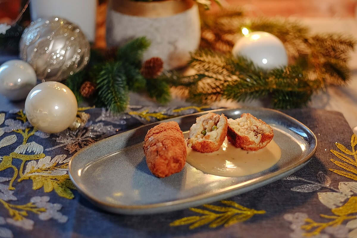 Die Arancini panieren (durch Mehl, Ei und Paniermehl ziehen) und bei 180 °C im Fettbad 4 bis 5 Minuten frittieren. Mit der Käsesauce servieren.