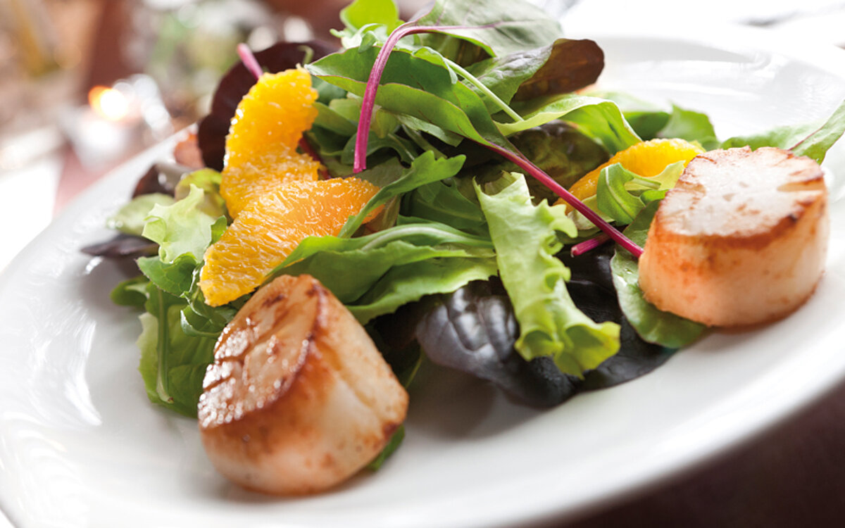 Salat mit Orangen und Jakobsmuscheln