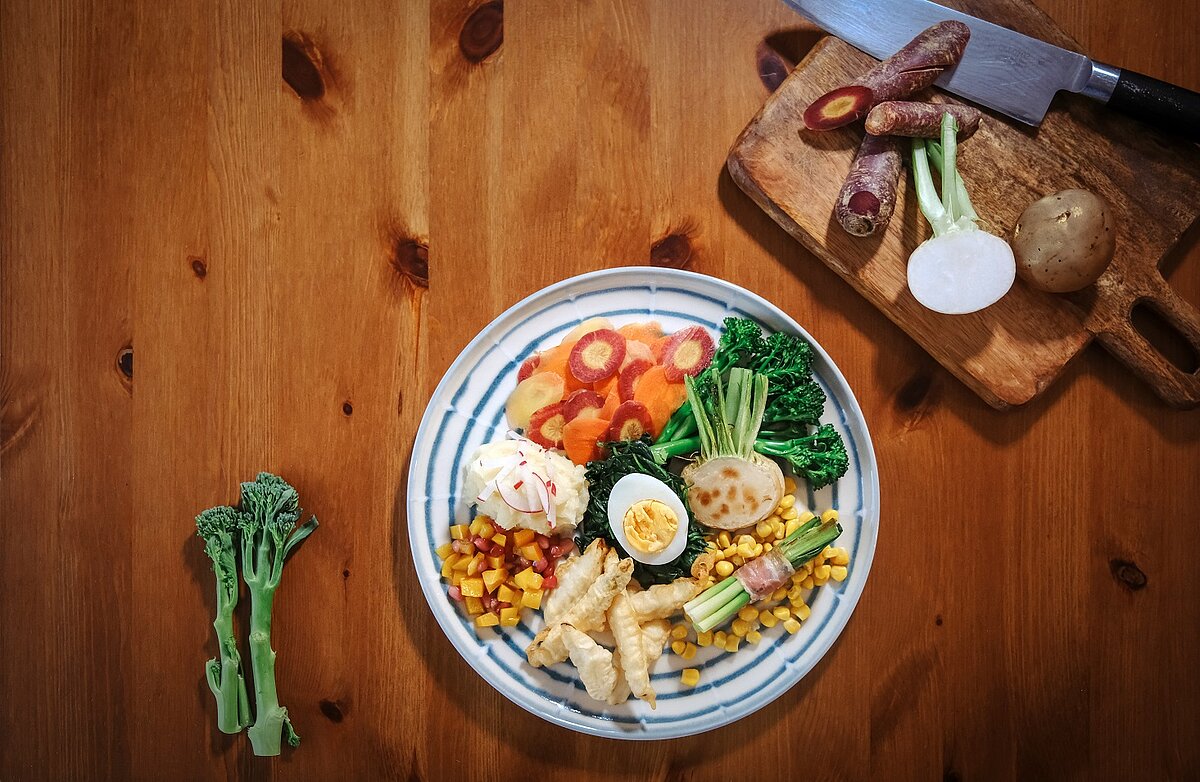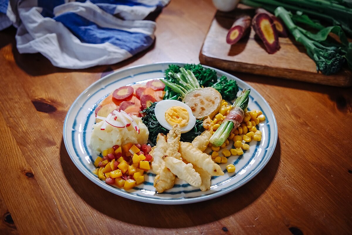 Paprika entkernen und in kleine Würfel schneiden. Einige Granatapfelkerne zugeben und beides in Olivenöl anschwitzen. Frühlingslauch putzen, kurz blanchieren und abschrecken. Dann mit Bacon umwickeln und in Butter braten. Nun den Mais kurz anschwitzen. Den Wilden Brokkoli (auch Stangenkohl) ebenfalls blanchieren und durch Butter schwenken. Nur leicht salzen. Das komplette Gemüse sollte nur leicht gewürzt werden. So behält es den Eigengeschmack. Den Spinat putzen, waschen und kurz in Butter anschwenken. Je zwei lila, gelbe und rote Möhren schälen und in dünne Scheiben schneiden oder hobeln, anschwitzen und mit Deckel einige Minuten lang dämpfen. Den Rettich schälen und in grobe Scheiben schneiden, gern mit etwas Grün. Die Scheiben circa drei Minuten köcheln und anschließend in der Pfanne braten. Die Pastinaken schälen, grob schneiden und in Salzwasser weichkochen, etwas Butter zugeben und mit dem Mixstab pürieren. Dann mit einigen Radieschen garnieren. Den Spargel schälen und in grobe Stücke schneiden. Mehl und Stärke mit etwas Wasser glattrühren (Konsistenz wie Pfannkuchenteig). Die Spargelstücke würzen, mit etwas Mehl bestäuben, durch den Teig ziehen und im Fettbad ausbacken.