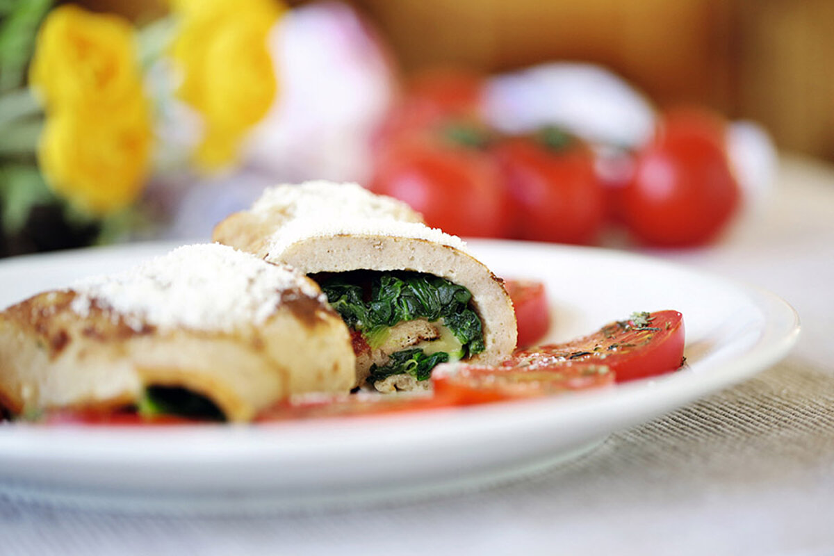 Vollkornpfannkuchen gefüllt mit Käse und Spinat auf marinierten Tomaten