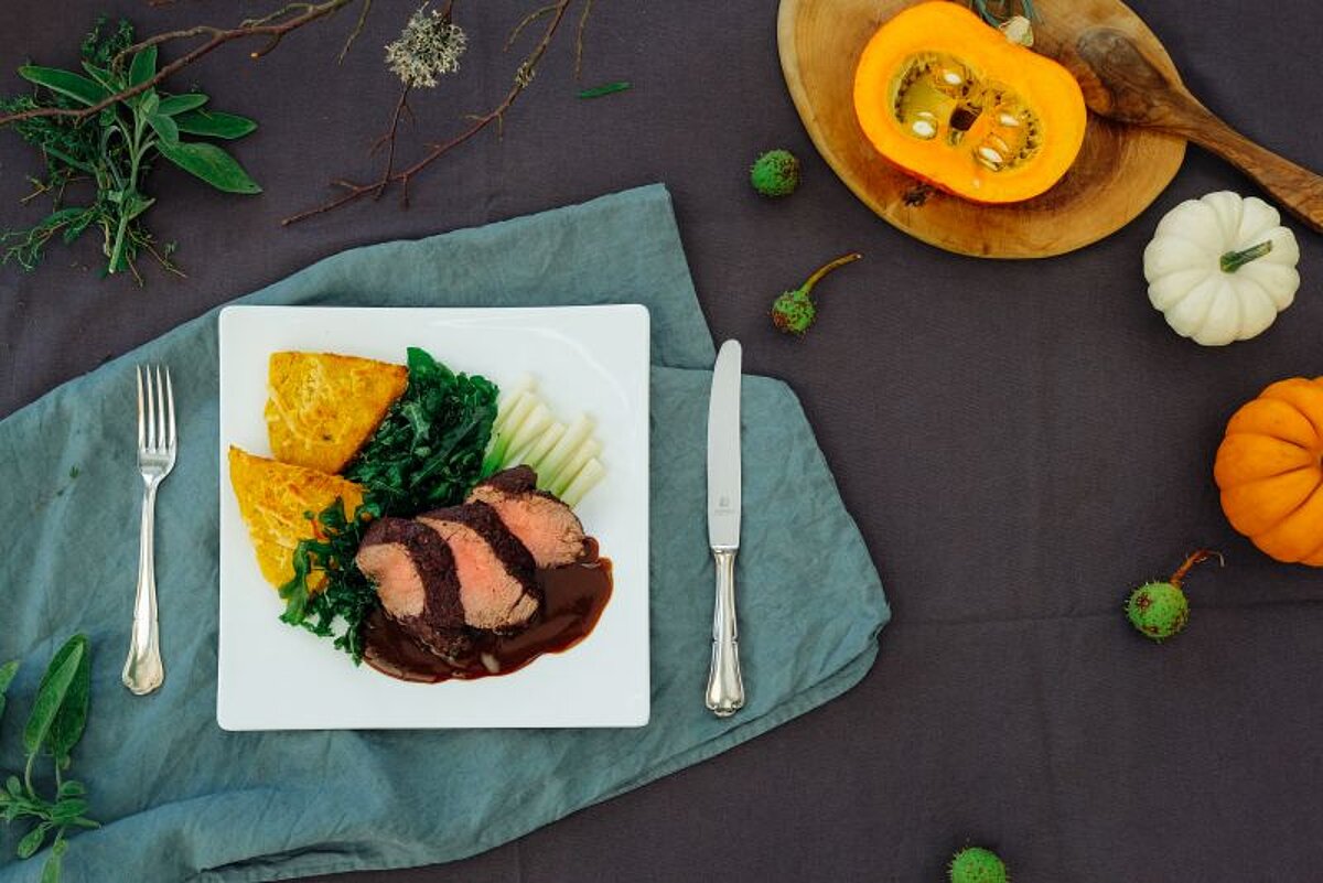 In Rotwein pochiertes Rinderfilet mit Portweinsauce dazu Kürbisecken, Lauchzwiebeln und gebackene Rauke.