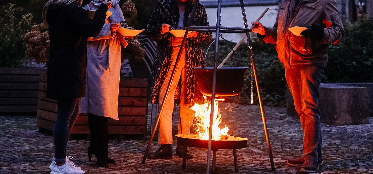 Hirschgulasch mit Salz und Pfeffer würzen und in kleinen Mengen scharf anbraten. Das angebratene Fleisch in den Kessel geben. Schalotten und Pastinaken im Bratenansatz anschwitzen, Tomatenmark zugeben und gut rösten, zwei– bis dreimal mit Rotwein ablöschen. Die Trockenpilze in reichlich Wasser ca. 1 Std. einweichen, danach durch ein Sieb abgießen und grob schneiden. Das Pilzwasser, den Wildfond und den restlichen Rotwein mit den Gewürzen ca. 1 Std. köcheln. Diesen Fond durch ein Sieb zu dem angebratenenFleisch und den restlichen Zutaten geben. Alles zusammen über dem Feuer bei schwacher Hitze ca. ½ Std. garziehen. Zum Schluss das Gulasch mit der Stärke binden, die Preiselbeeren zugeben. Mit einem kräftigen Baguette servieren. Knödel und Rotkohl passen natürlich auch.