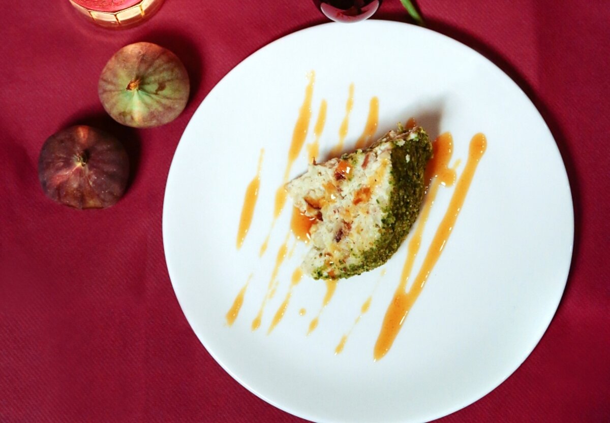 Zum Schluss die Pistazien fein hacken, den Milchreis stürzen und mit den Pistazien bestreuen. Schließlich die Orangen pressen und den Saft mit dem Zucker zu einem Sirup einkochen. Damit die "Reisschnitte" garnieren.