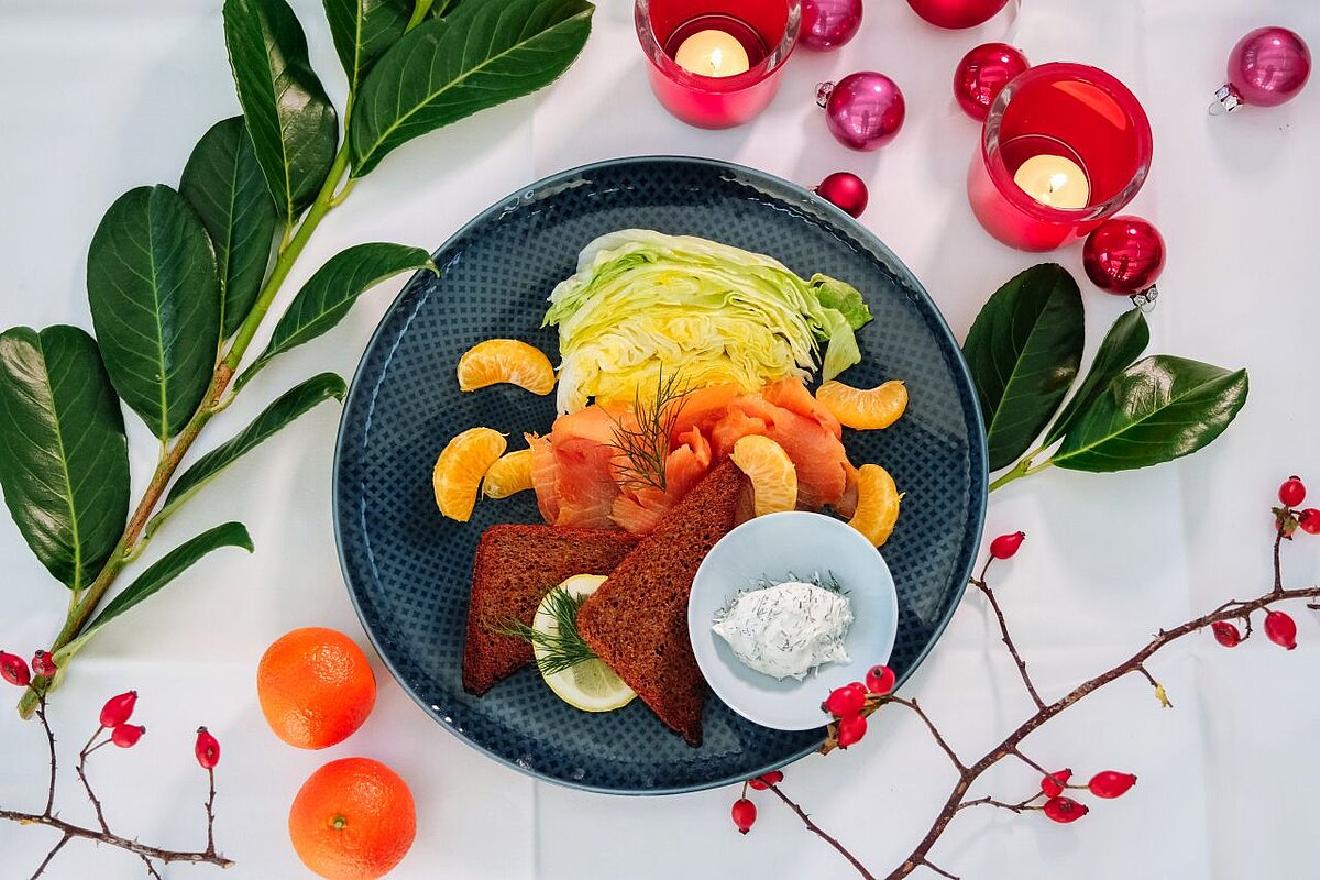 Den Salat in acht Stücke schneiden, Lachs in dünne Scheiben schneiden. Aus dem Saft einer Mandarine, Balsamico, Olivenöl, Salz und Pfeffer ein Dressing machen. Die Lachsscheiben mit Salz und Pfeffer würzen und mit dem Dressing marinieren. Restliches Dressing auf den Salat geben. Die Mandarinen schälen und die Filets abtrennen.