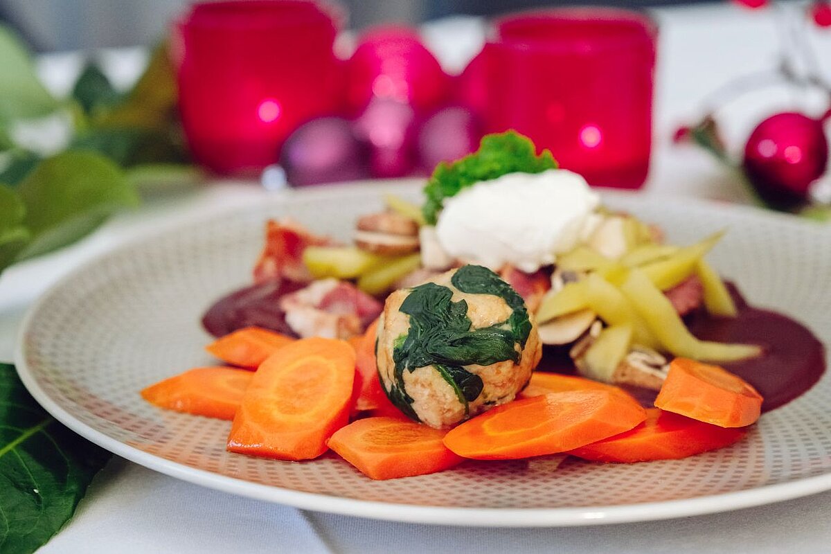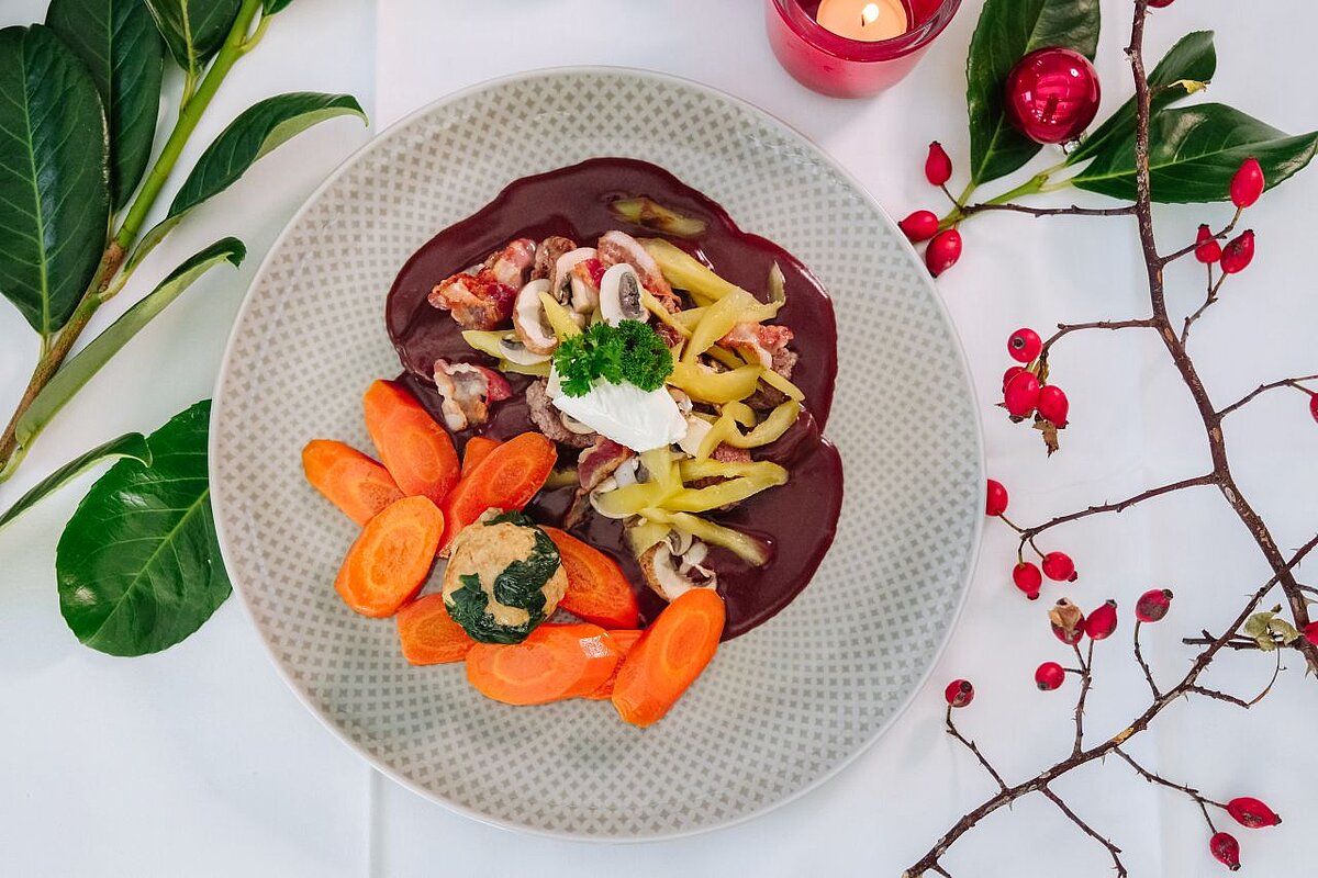 Rinderfilet in Streifen schneiden, würzen und sehr heiß kurz anbraten. Die Soße mit Senf vermischen. Gurken schälen und entkernen in Streifen schneiden, den Bacon in Streifen schneiden, Champignons in Scheiben schneiden, alles in etwas Butter anschwitzen. Die Soße aufkochen und die Filetspitzen darin ziehen lassen. Die Filetspitzen mit der Garnitur, etwas Schmand und Petersilie anrichten.
