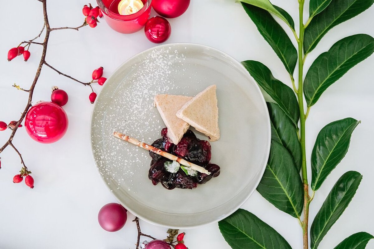 Eigelb, Zucker, Zimt und Rum über dem Wasserbad warm aufschlagen, geschmolzene Schokolade zugeben. Die Masse abkühlen lassen, die Sahne unterheben, in Formen füllen und einfrieren. Die Feigen halbieren. Rotwein, Cassislikör und Honig einkochen. Die Feigen darin marinieren.