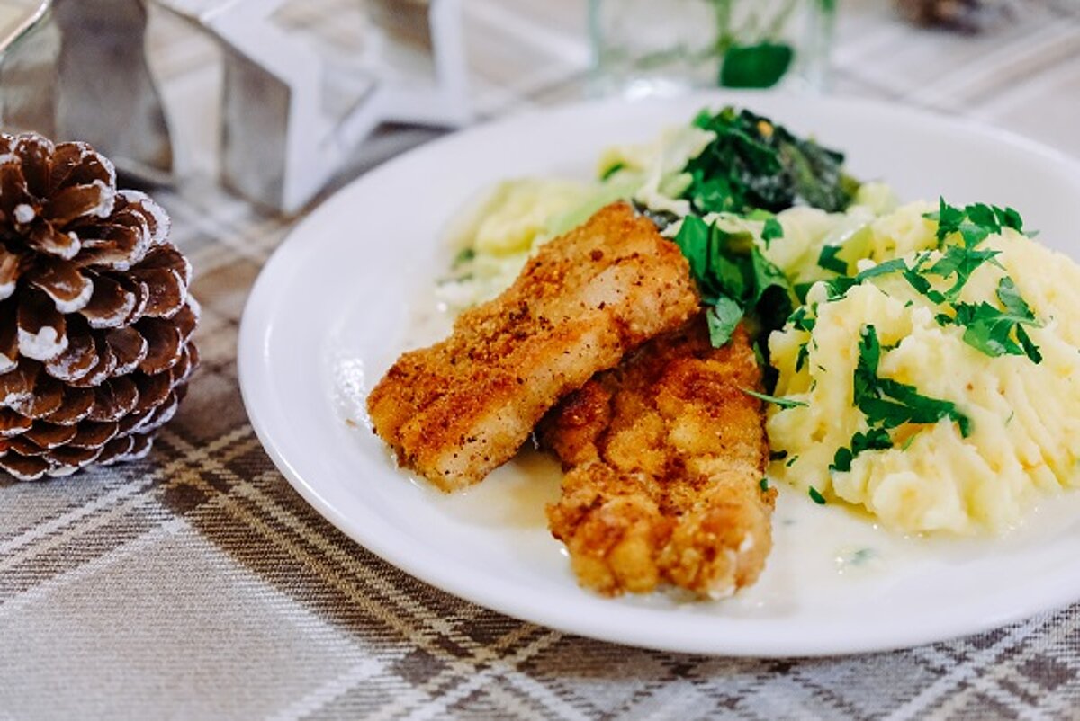 Panierter Schweinebauch, Rahmwirsing und Kartoffel-Möhrenstampf