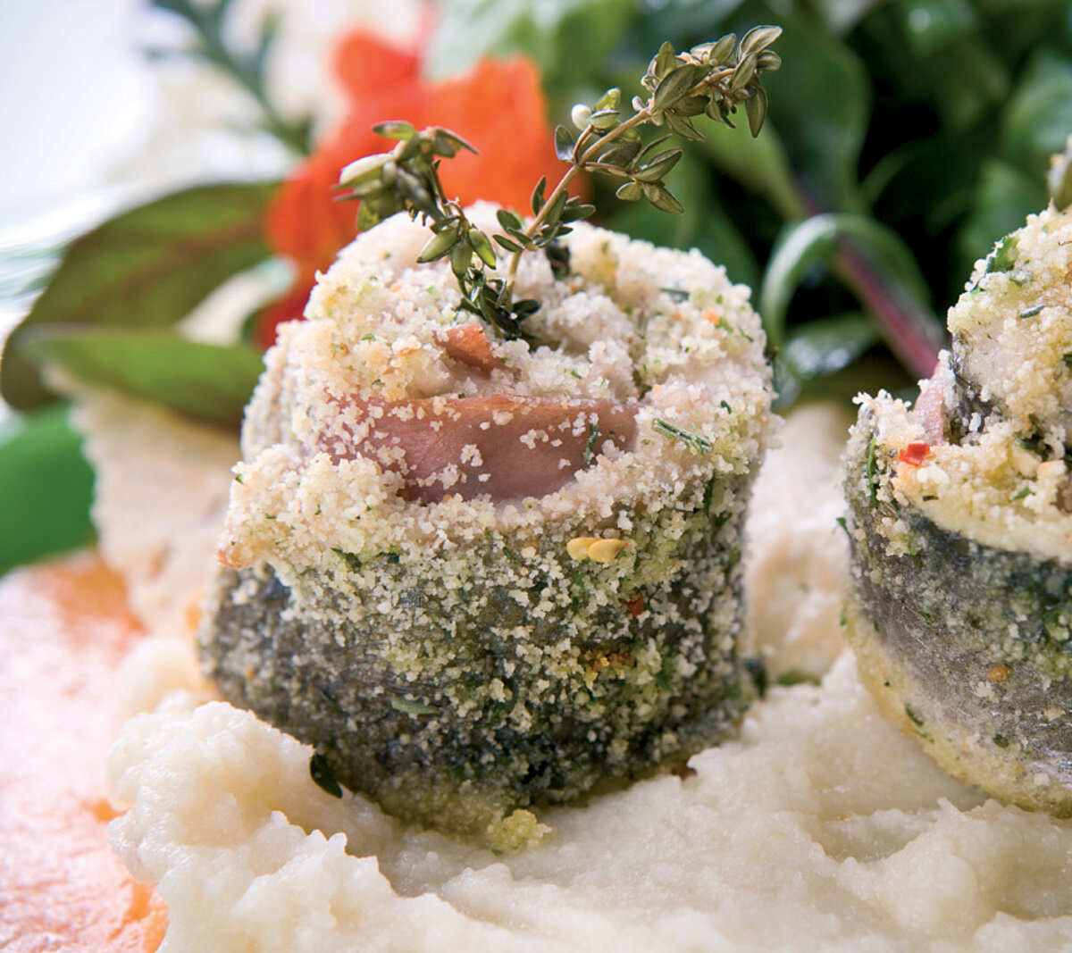 Involtini von Loup de Mer auf Vanille- Selleriepüree mit Salat im Parmesankorb