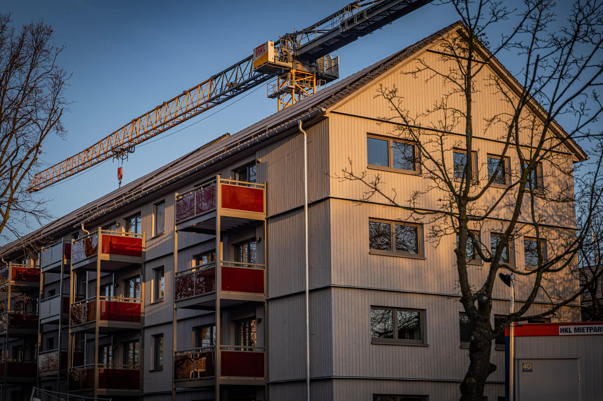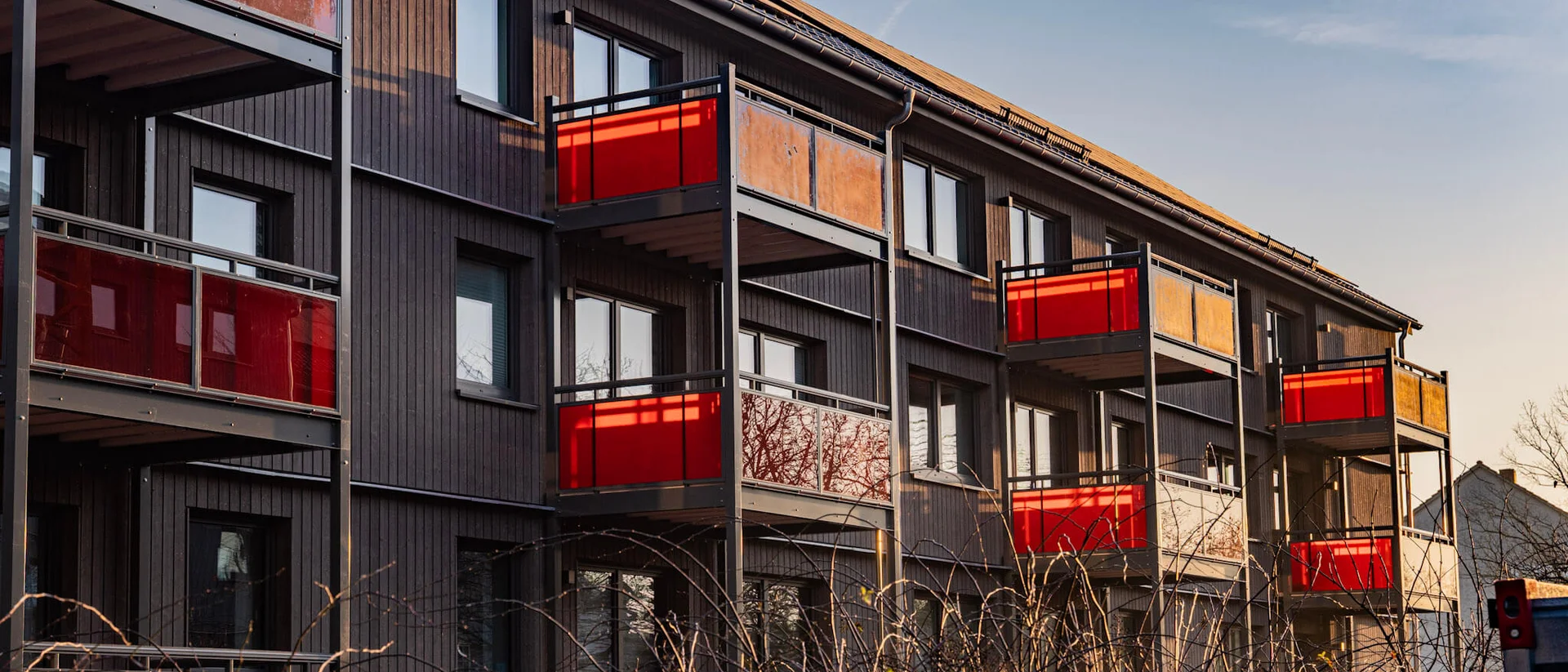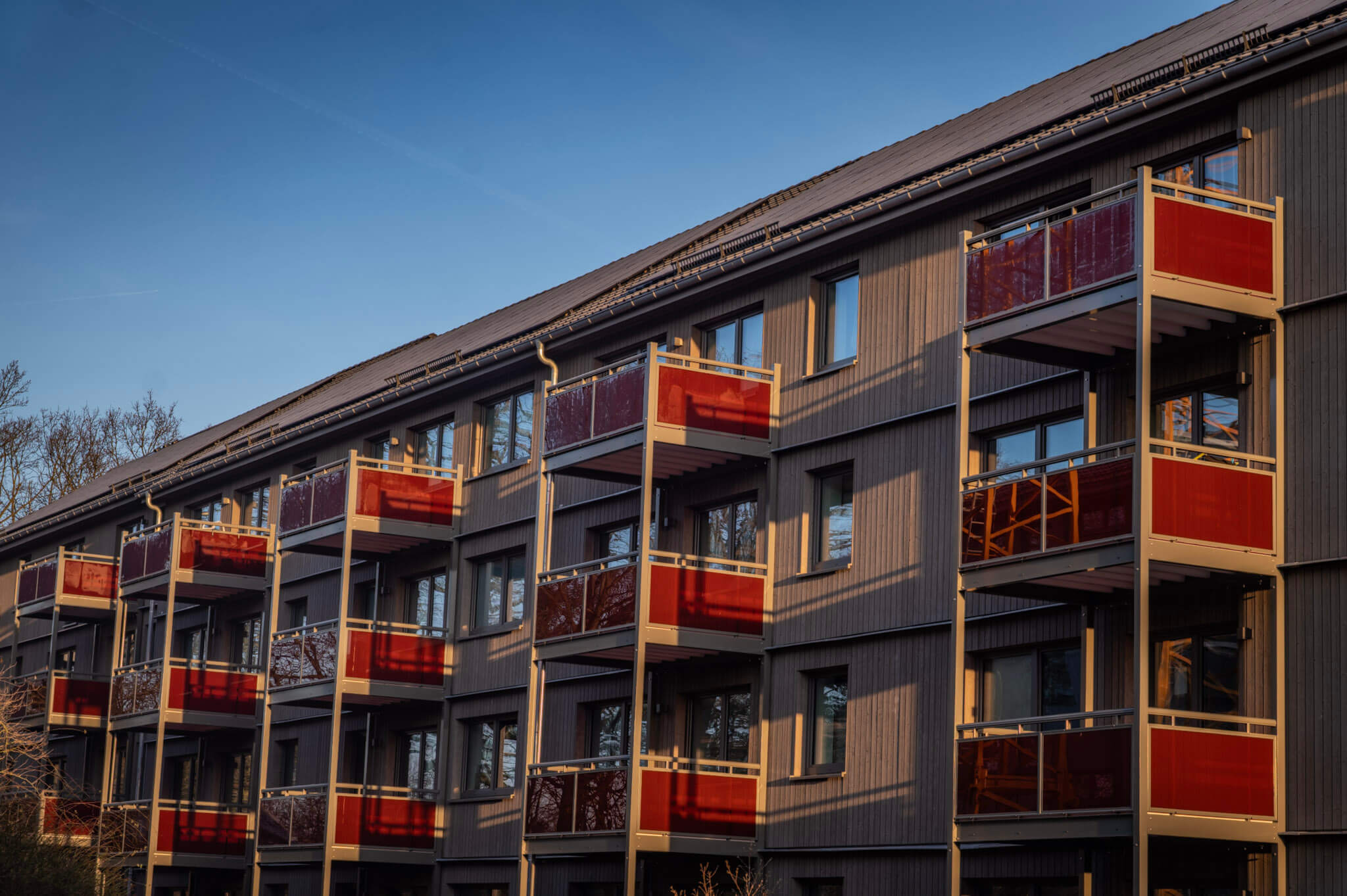 Am Schlesierweg zeigt die NEULAND, wie Sanierung heute geht: Vorgefertigte Holzbaufassaden werden vor Ort montiert, während die Mieter:innen in ihren Wohnungen bleiben. Das Ergebnis: niedrigere Heizkosten bei moderater Mietenanpassung.