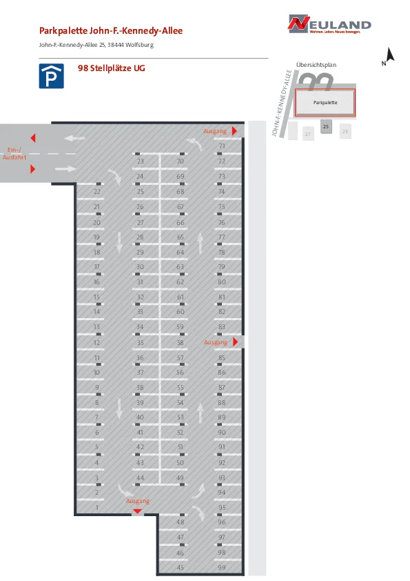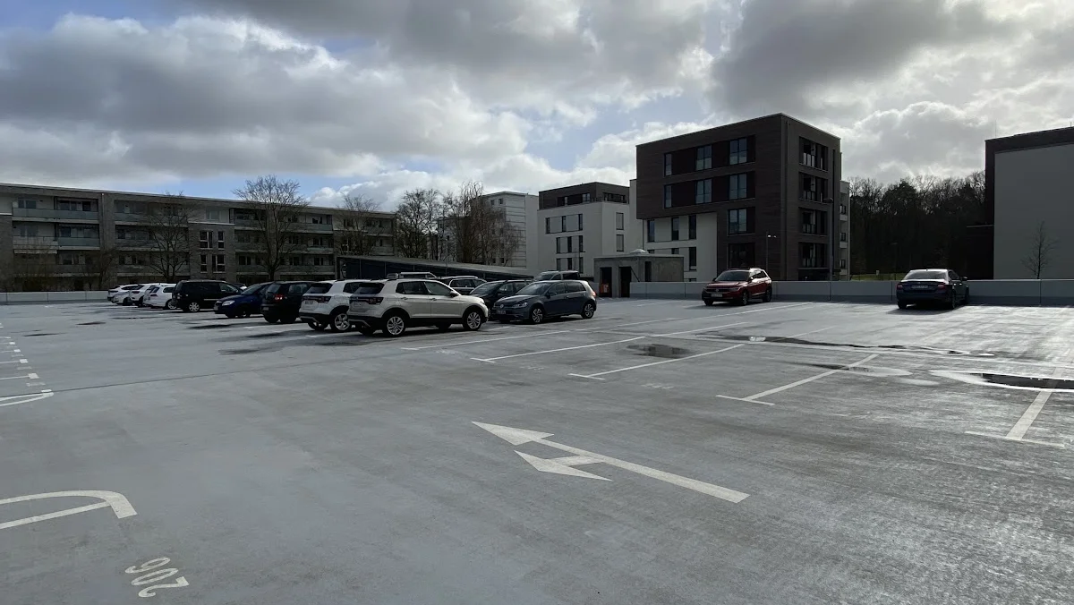 Sie erreichen die Parkpalette direkt über die John-F.-Kennedy-Allee. Das Obergeschoss wurde vor kurzem durch uns saniert. Auch das Mittelgeschoss sowie das Untergeschoss befinden sich aktuell in der Sanierung. Auch E-Lademöglichkeiten sind hier zukünftig geplant.