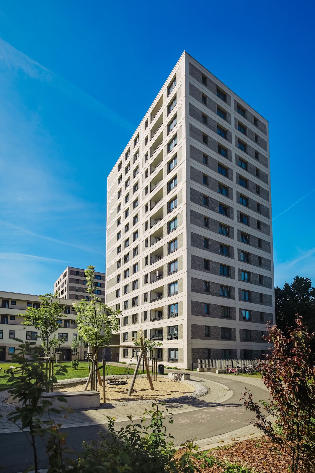 Im Außenbereich bieten großzügige Gemeinschafts-, Spiel- und Grünflächen Raum für Entspannung und geselliges Miteinander. Die Massivhäuser verfügen über die Energieeffizienzklasse KfW 55.