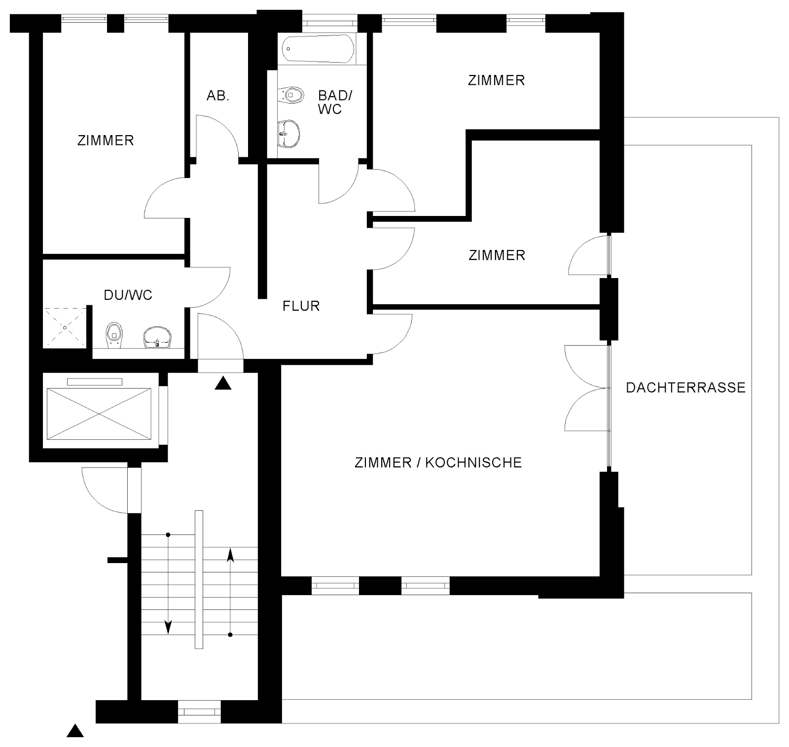 - Zimmer 1: 14,82 m², Zimmer 2: 13,42 m², Zimmer 3: 14,37 m², Küche / Zimmer 4: 38,01 m², Bad 1: 6,17 m², Bad 2: 5,84 m², Flur 1: 15,56 m², Abstellraum 1: 3,38 m², Dachterrasse 1: 27,15 m²