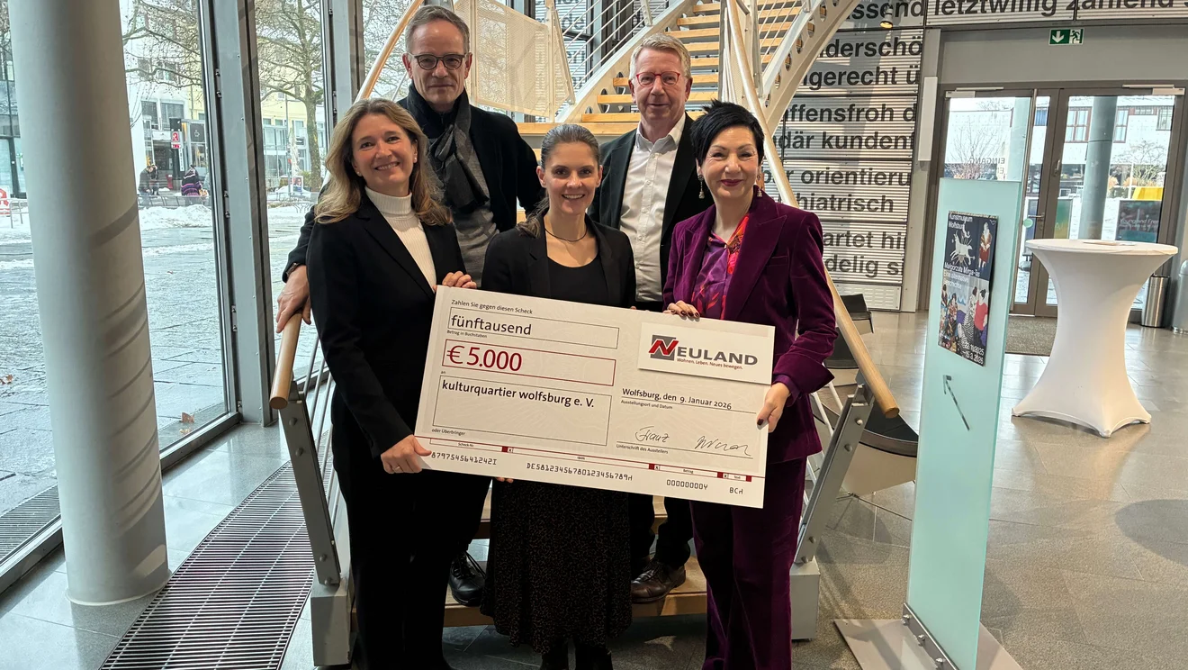 Wolfsburg, 13. Januar 2026 – Die NEULAND Wohnungsgesellschaft mbH übergab an diesem Freitag eine Neujahrsspende in Höhe von 5.000 Euro an das kulturquartier wolfsburg e.V. Die symbolische Spendenübergabe fand im Kunstmuseum statt. An der Übergabe nahmen seitens der NEULAND die Geschäftsführung mit Hans-Dieter Brand und Irina Franz sowie die Aufsichtsratsvorsitzende Immacolata Glosemeyer teil. Das kulturquartier wolfsburg e.V. wurde durch Otmar Böhmer, ersten Vorsitzenden des Vereins, sowie Eileen Pollex, Schatzmeisterin, vertreten.