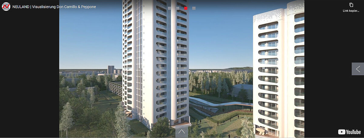 In Detmerode werden die in den 1960 errichteten Hochhäuser Don Camillo+Peppone von der NEULAND saniert. Die 13 und 23 Stockwerke hohen Gebäude werden komplett entkernt, die Schadstoffe gesondert entsorgt und im Anschluss die Gebäude nach Plänen des Architekten Chris Doray um den bestehenden Rohbau wiederaufgebaut. Dabei erhalten die Gebäude ringsum eine von außen neu vorgestellte Balkonkonstruktion, die in die Fassade integriert wird. Der Architekt aus Vancouver arbeitet weltweit und ist Experte auf dem Gebiet der Hochhausplanung. Besonders spannend wird demnach auch die neue Fassade aussehen: Hier sind Metallelemente geplant, die eine automobile Anmutung vermitteln werden. Das Design der beiden Gebäude wird so ein einzigartiger Hingucker bei der Anfahrt auf die Autostadt Wolfsburg.