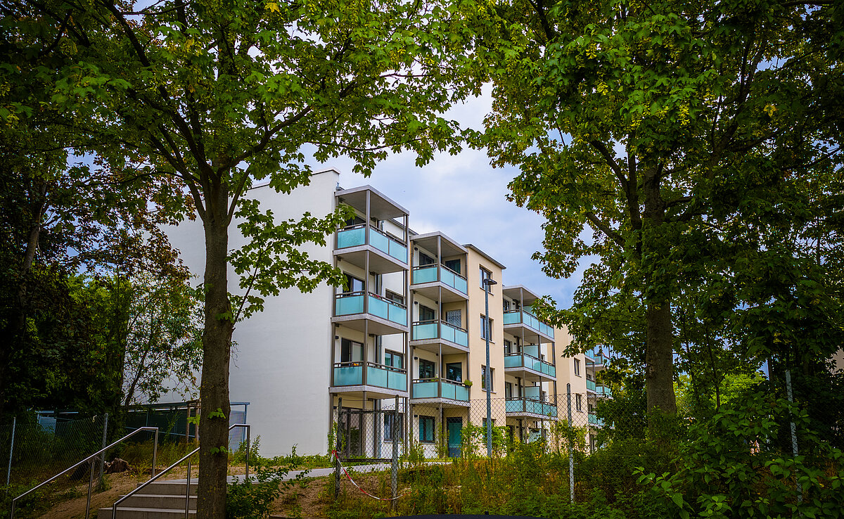 Am Sportplatz in der Theodor-Heuss-Straße in Detmerode gibt es zwei neue Gebäude im Rahmen des „Wohnen für Alle“-Konzeptes. In diesen wurde mit 48 Wohneinheiten neuer Lebensraum für Singles und Familien geschaffen. Trotz der gesenkten Baukosten müssen die Mieter nicht auf Komfort wie Aufzüge, Barrierearmut oder Balkone verzichten. Tolle Bäder ergänzen den modernen Ausstattungsstandard.