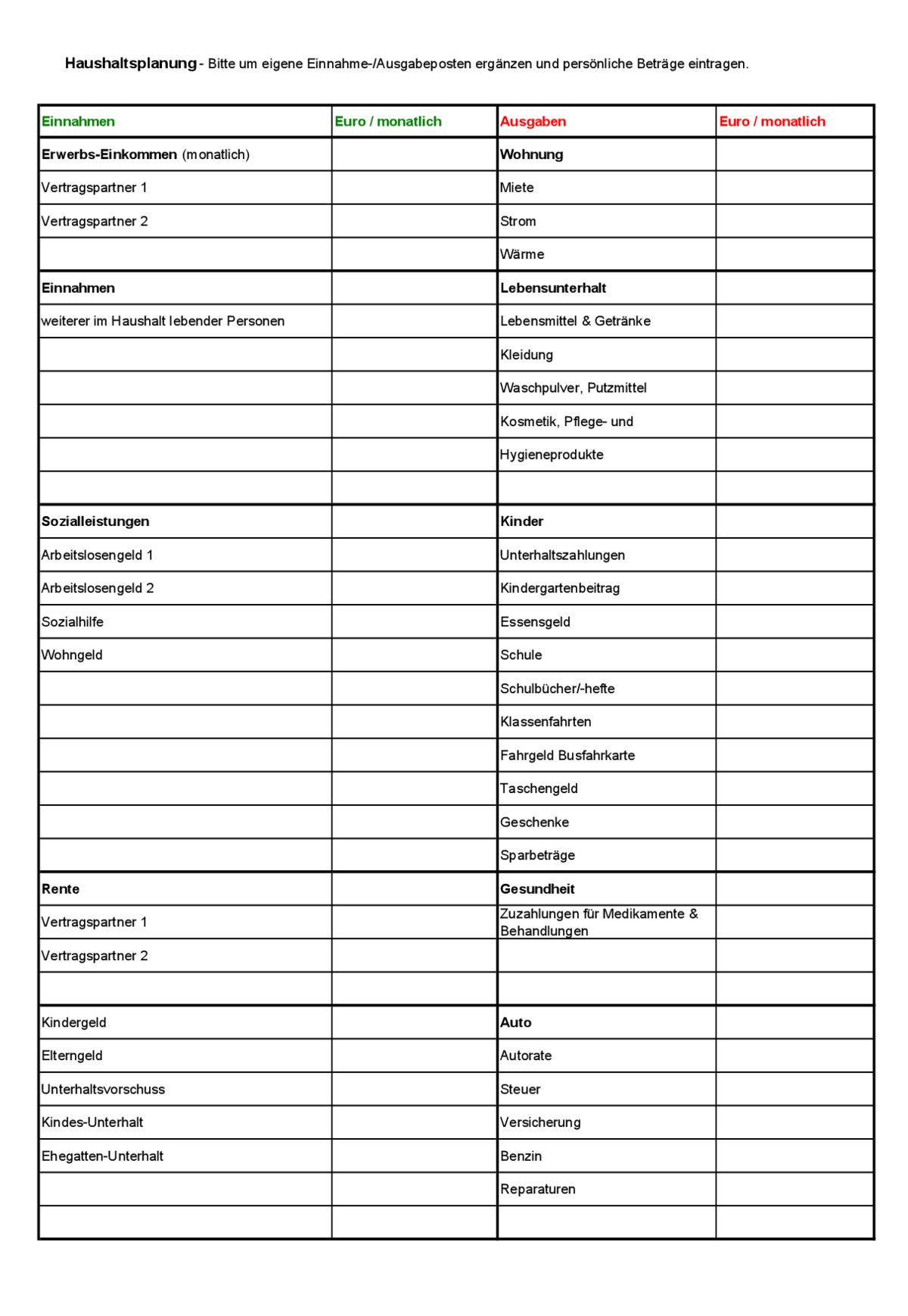 Geldprobleme? Wer kennt das nicht! Schnell gerät man in die roten Zahlen und tappt in eine Schuldenfalle. Besser wäre es, seine Finanzsituation stets im Auge zu behalten und nicht über seine Verhältnisse zu leben. Damit das besser gelingt, finden Sie hier wichtige Tipps und eine Auflistung von möglichen monatlichen Einnahme- und Ausgabe-Posten, die Sie Ihrer konkreten Situation anpassen können. Wenn Ihre Ausgaben höher sind als Ihre Einnahmen, dann überlegen Sie bitte, wo sie sparen können und ergreifen die nötigen Maßnahmen. So haben Sie jetzt in jedem Fall einen realistischen Überblick über Ihre Finanzen und ersparen sich langfristig einige "böse Überraschungen".