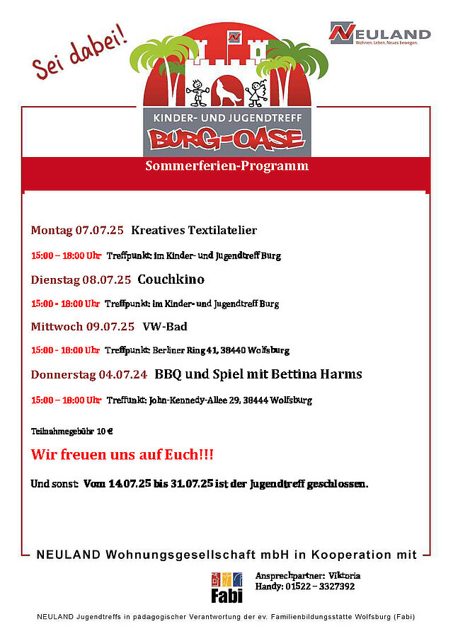 Und sonst: Vom 14.07.25 bis 31.07.25 ist der Jugendtreff geschlossen.