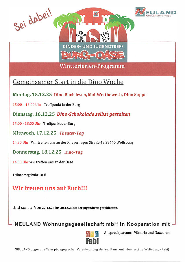 Bei der Betreuung der Kinder und Jugendlichen arbeiten wir mit einem Kooperationspartner, der evangelischen Familienbildungsstätte Wolfsburg (Fabi), zusammen. Die FaBi ist in der pädagogischen Verantwortung und bietet neben der Betreuung der Kinder und Jugendlichen auch spannende Quartiersaktivitäten sowie Beratungen und Elternarbeit im Rahmen der Jugendtreffarbeit an.